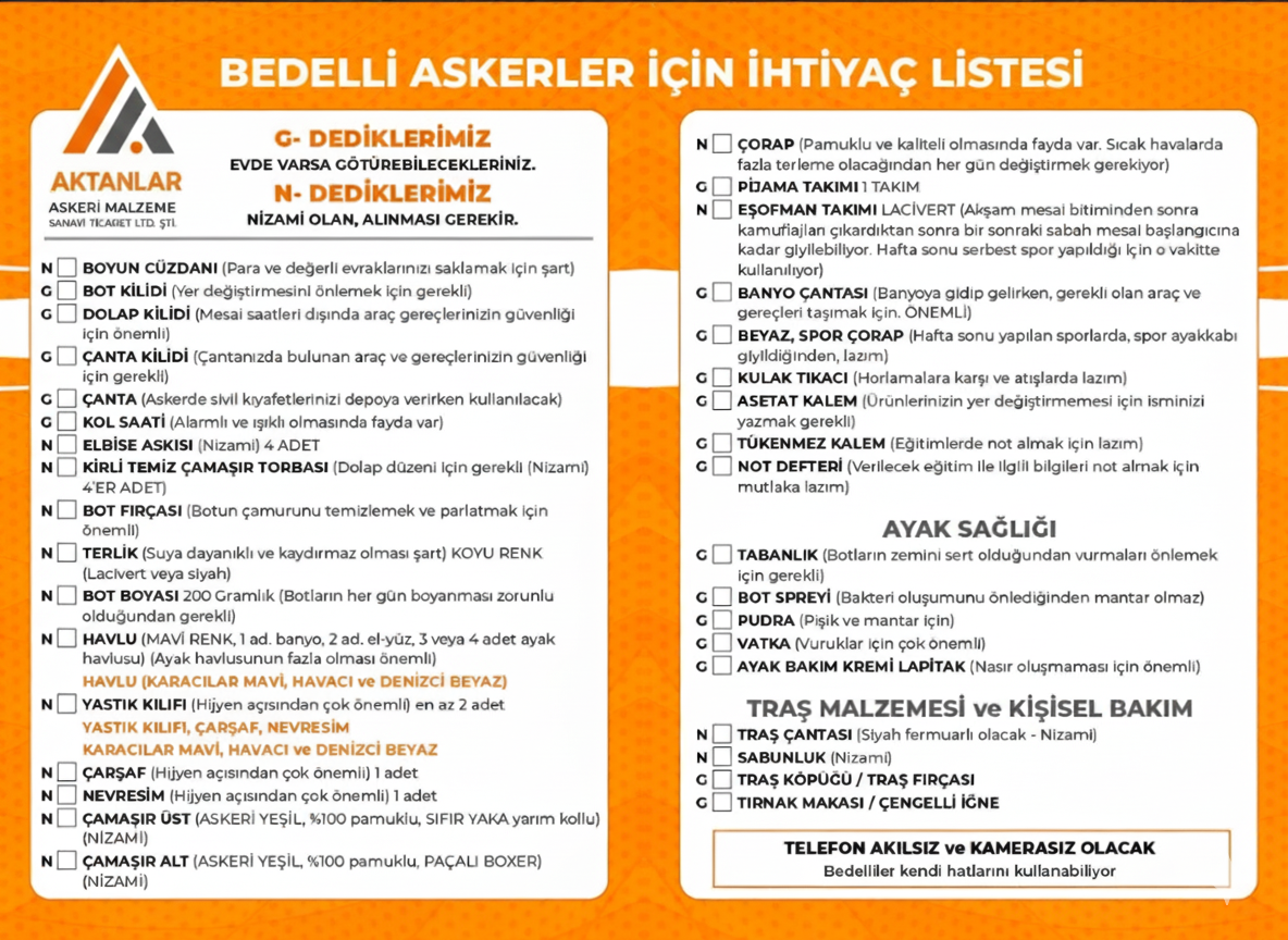 "Önemli Not: Listemizde yer alan ürünler bilgilendirme amaçlıdır. Kışlada tarafınıza 1 adet havlu verilmektedir; ancak hijyen kuralları ve kullanım kolaylığı açısından yanınızda yedek havlu bulundurmanız önemle tavsiye edilir. Setlerimiz, kışla dağıtımı göz önünde bulundurularak eksiklerinizi tamamlamak üzere hazırlanmıştır."