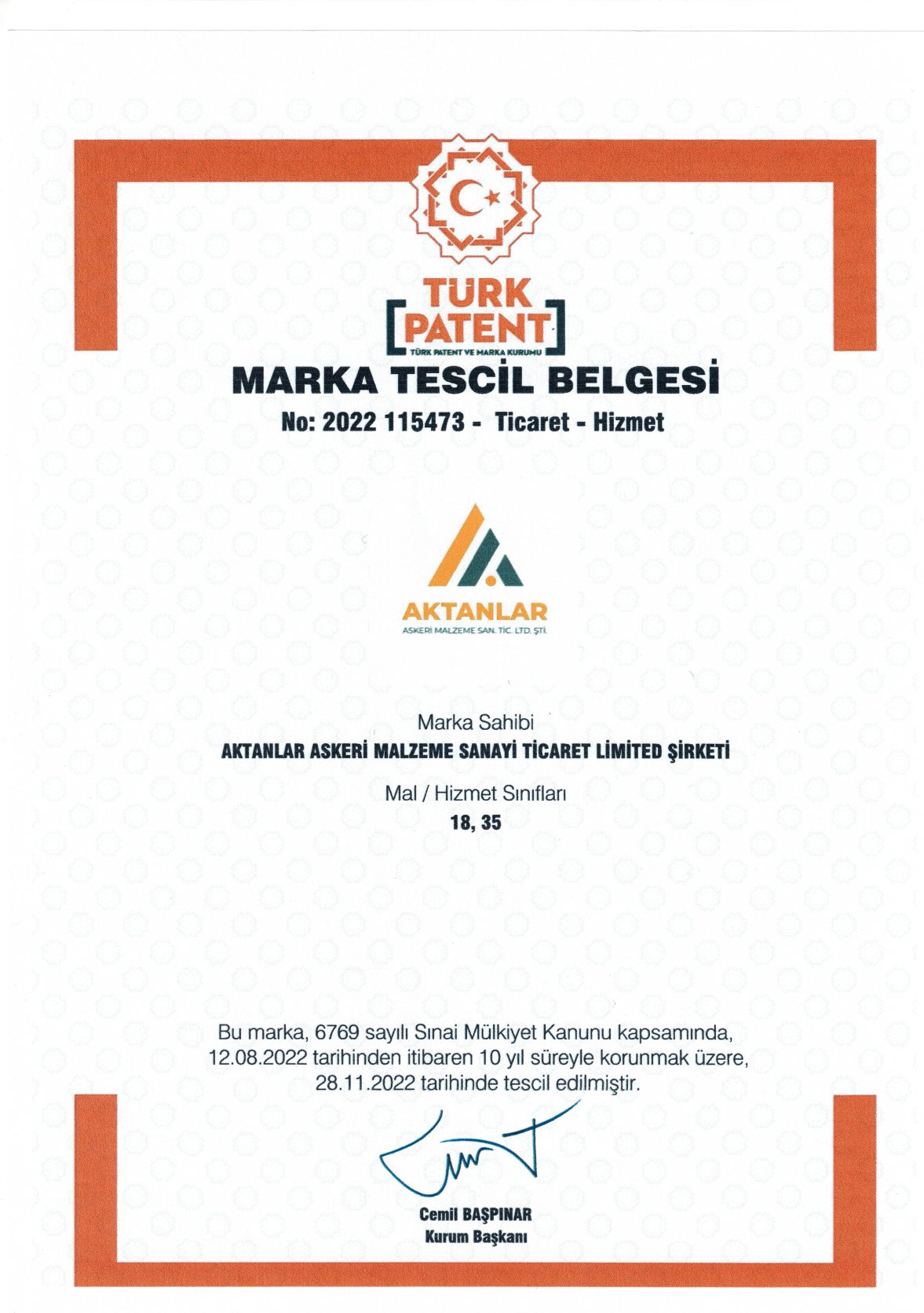 Aktanlar markası, Türk Patent ve Marka Kurumu tarafından resmi olarak tescillenmiş bir markadır. Bu belge, firmamızın ticari ismini ve ürün markasını yasal olarak koruduğunu göstermektedir. Müşterilerimize sunduğumuz ürünlerin kalitesi ve orijinalliği bu belgeyle desteklenmektedir.